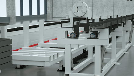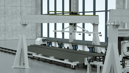 機械臂自動碼料,小車沿鐵送往工件吊裝區(qū)域。